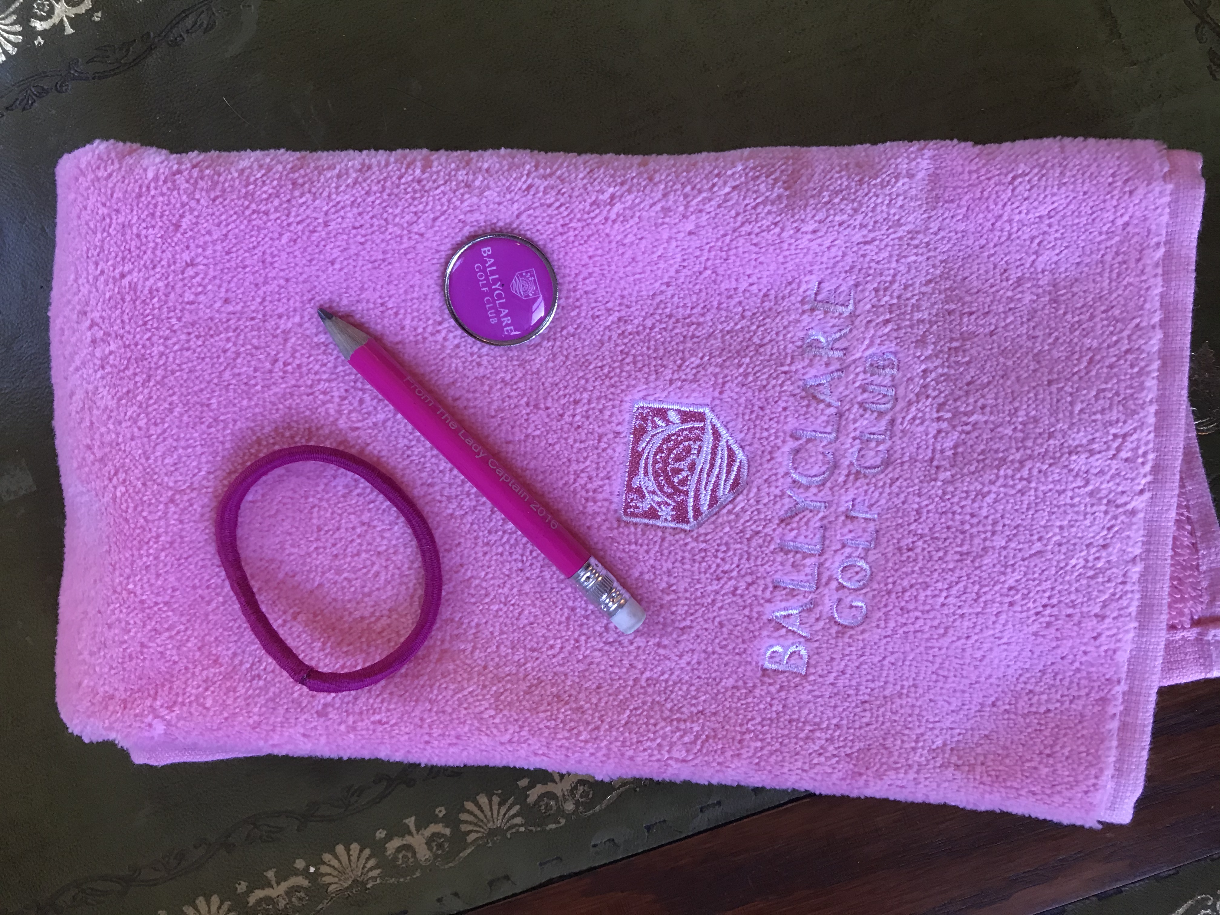 I tried to clean off as much mud as possible but nothing helped. Not even the air hose that cleans your shoes. The lovely ladies who’d let me join them even gave me little gifts. A pink ball marker and marking pencil. I also purchased a golf towel from the pro shop. Anyone who knows my golf clubs would know they match completely, being that they are pink and black.