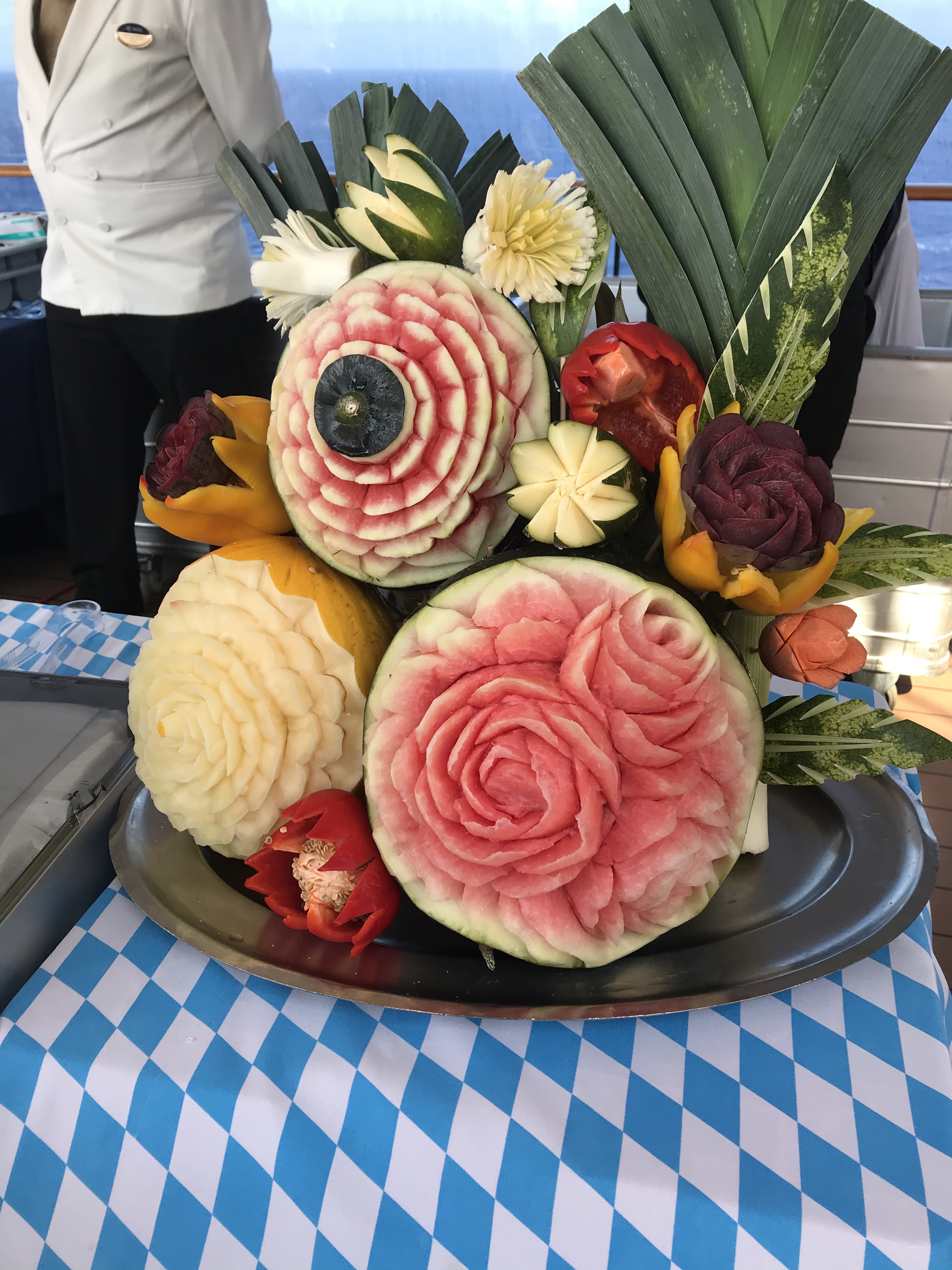 We had been meaning to get a seat on the deck but they were all taken. Passed by a table with a selection of food but I couldn’t help stopping to take a pic of the beautifully carved fruits.